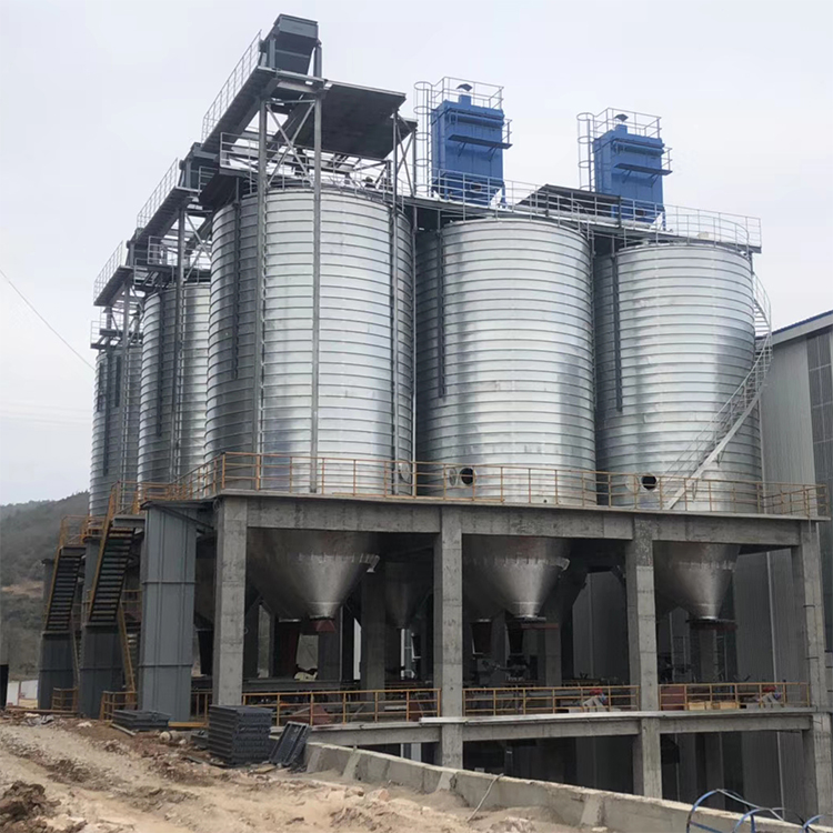 接收与清理设置在筒仓中央该形式筒仓一般采用对称排列,提升机井架固定,经过提升后的物料通过仓顶溜管进人筒仓。这种形式省去了仓顶输送设备和上通廊,从而节省了建造费用,缩短了建造工期。对于贮存时间要求较长的大型粮库,则应根据物料的流向、场地情况、工艺要求等合理地配置投料口、工作塔、烘干塔及图木舒克钢板仓的位置。国华钢板仓介绍了这几种常见的进料形式,实际中可将各种形式相互组合,相互渗透,根据实际情况合理搭配,灵活选用。